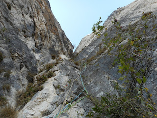 - si scalano le placchette sopra la sosta per 15 m e poi si piega a sinistra nel caminetto che porta dopo altri 20 m alla sosta in una stretta nicchia. 35 m, III+;