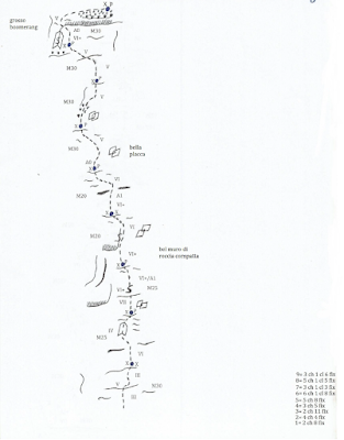 - 30 m; 6a+, con vari tettini, di cui uno di ragionamento. Tiro molto continuo.